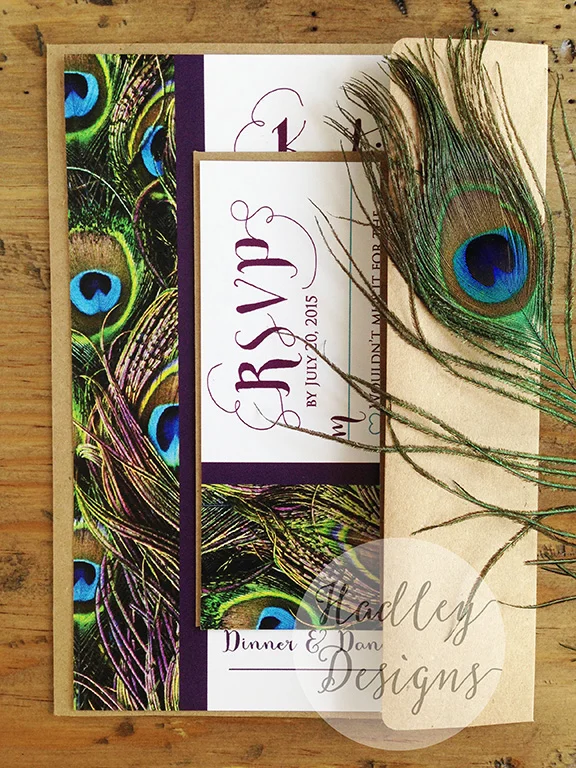 We are dying over this new trend of peacock themed weddings. These invitations and RSVPs turned out ADORABLE! The colors look perfect accented with kraft envelopes! Congrats to the soon to be Mr. & Mrs. Warren!