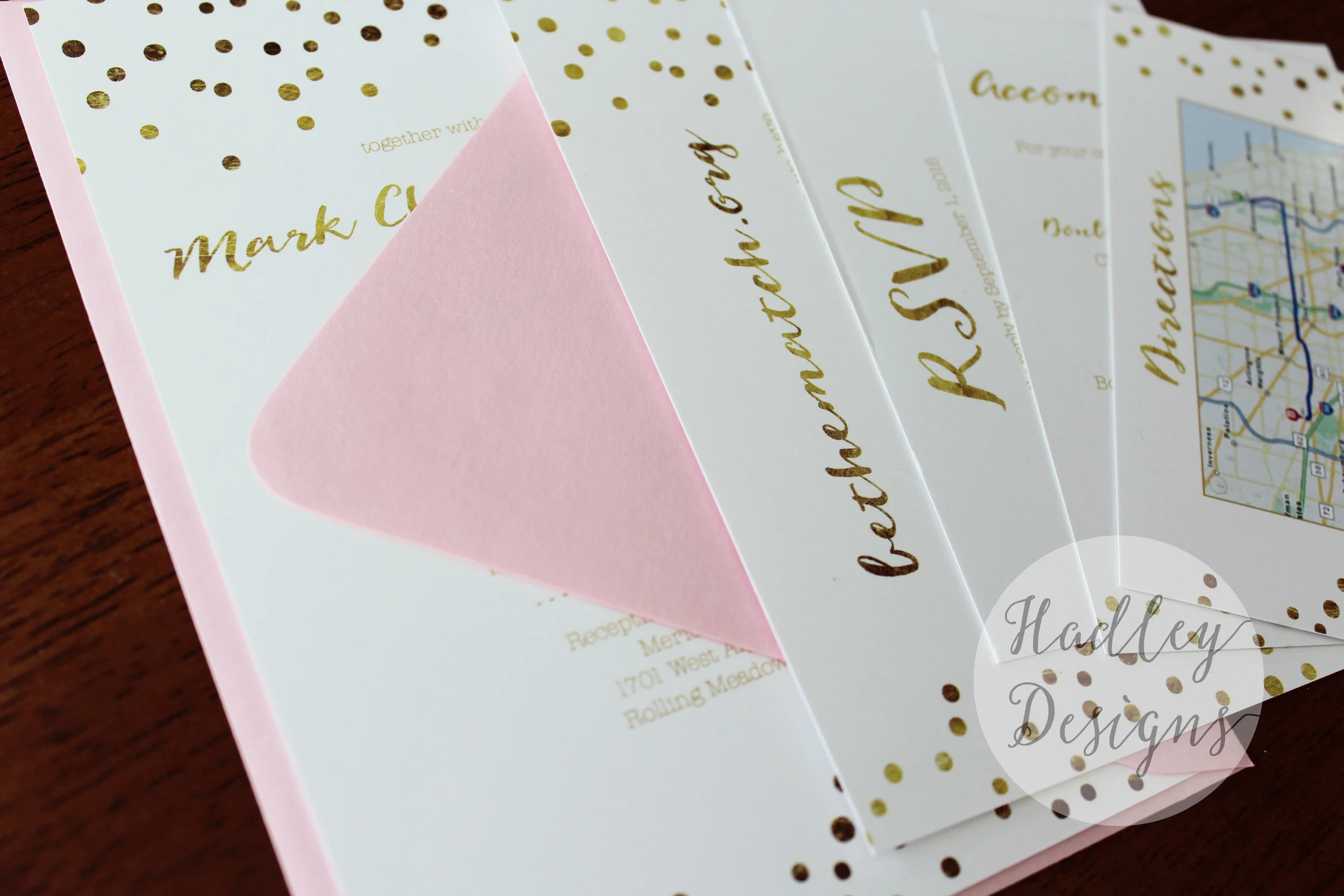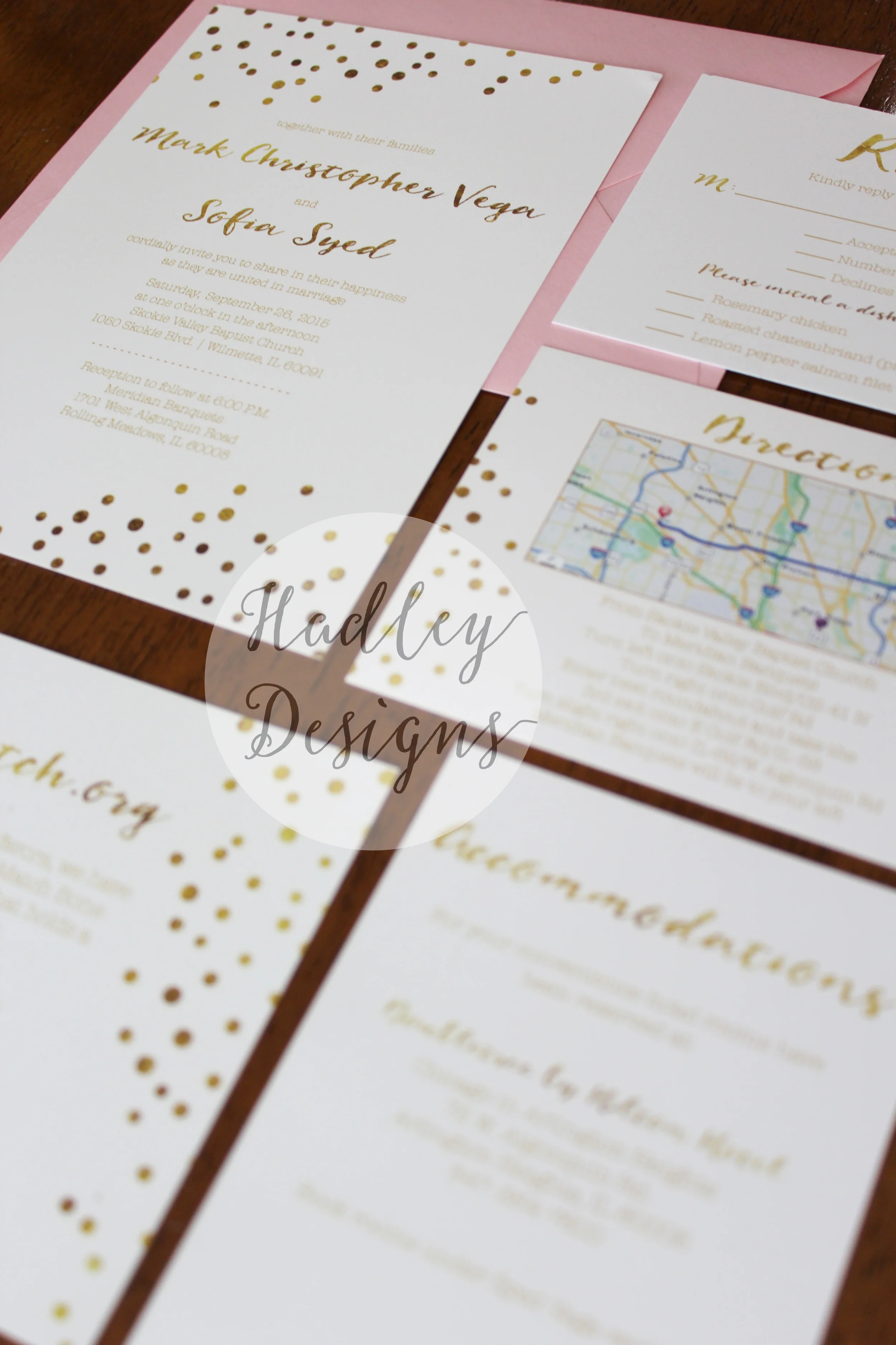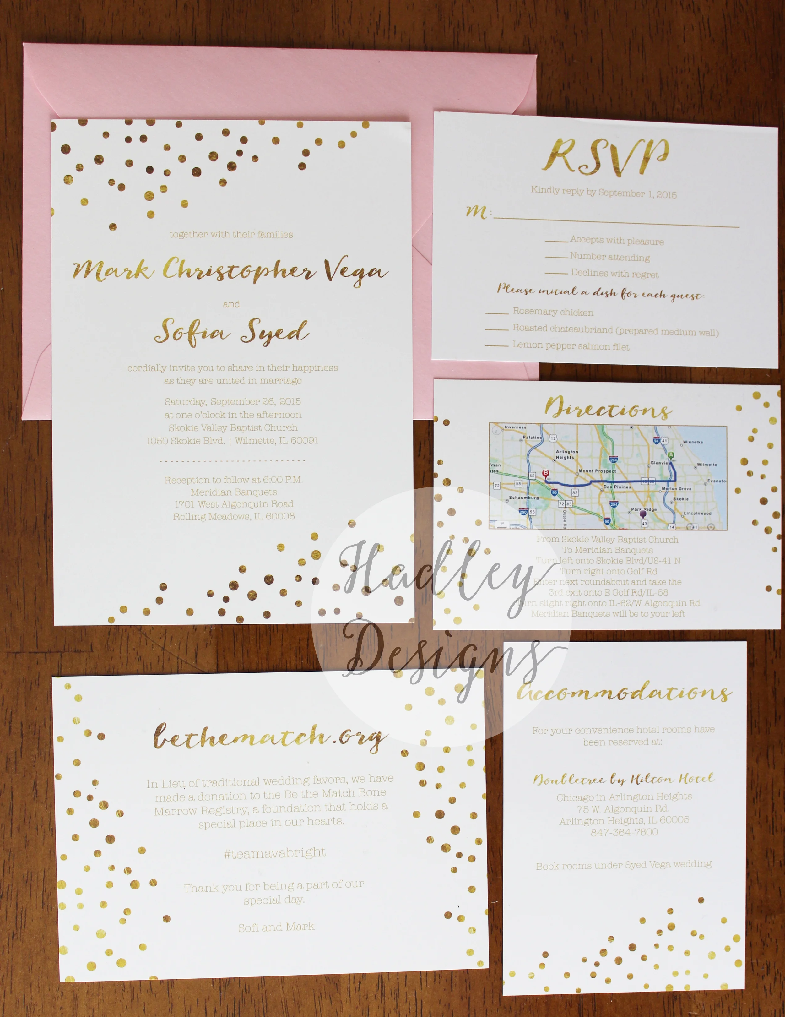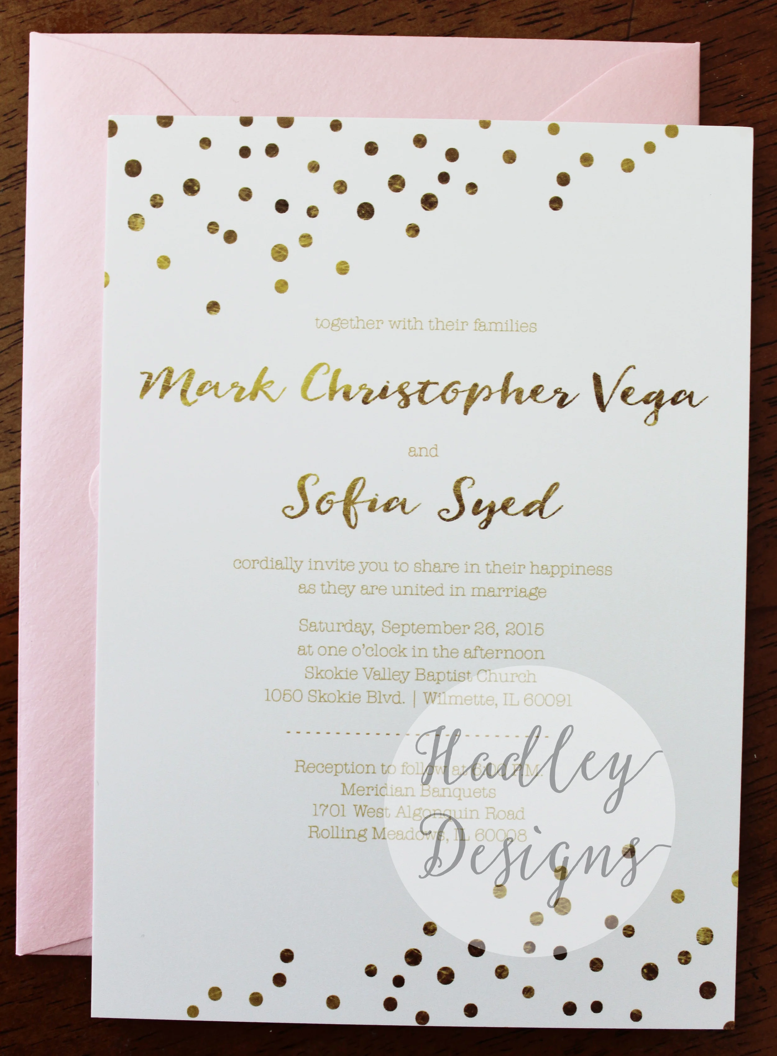 One of this years most popular wedding color schemes is the gorgeous blush and gold combination. This elegant combination is perfect for a glamorous yet classic wedding. Check out our most recent invitation design, we LOVE how they turned out and those blush envelopes top it off perfectly! Congrats to the soon to be Mr. & Mrs. Syed!